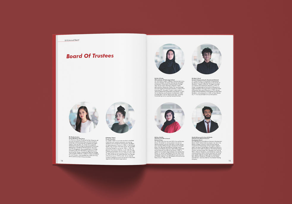 The theme of the annual report is "Minds in the making". The imagery chosen reflects the student's everyday lives on campus from the start till graduation. The maroon color used throughout is a rework of Bahrain Polytechnic's current color scheme.
